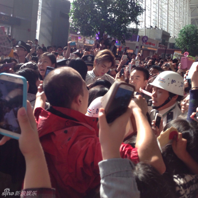 仍然堅持走普通通道與等候的粉絲打招呼,走到一半人牆卻被個別瘋狂粉絲沖散,保安只好奮力護送Kris進入安檢通道,Kris仍全程微笑並不忘和粉絲揮手道別。